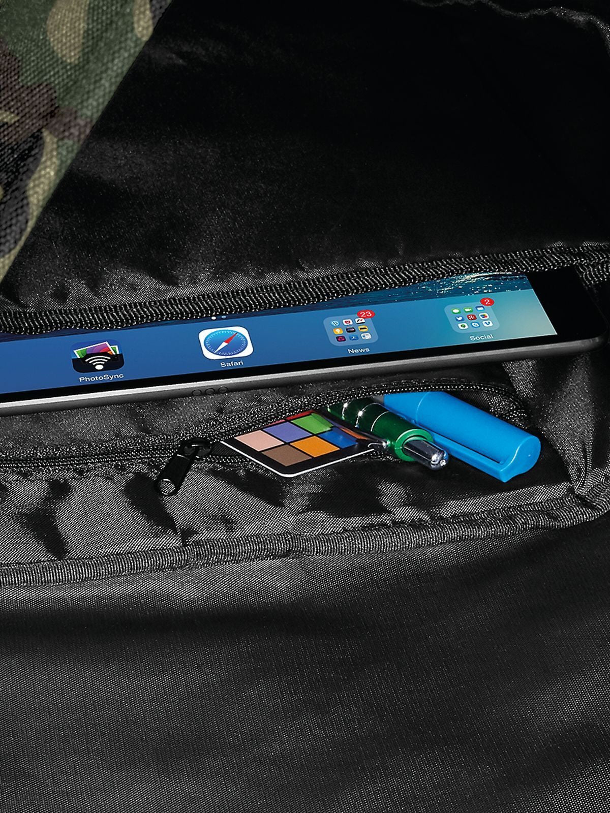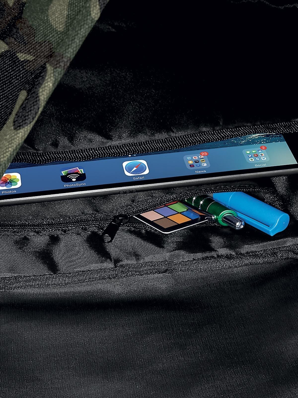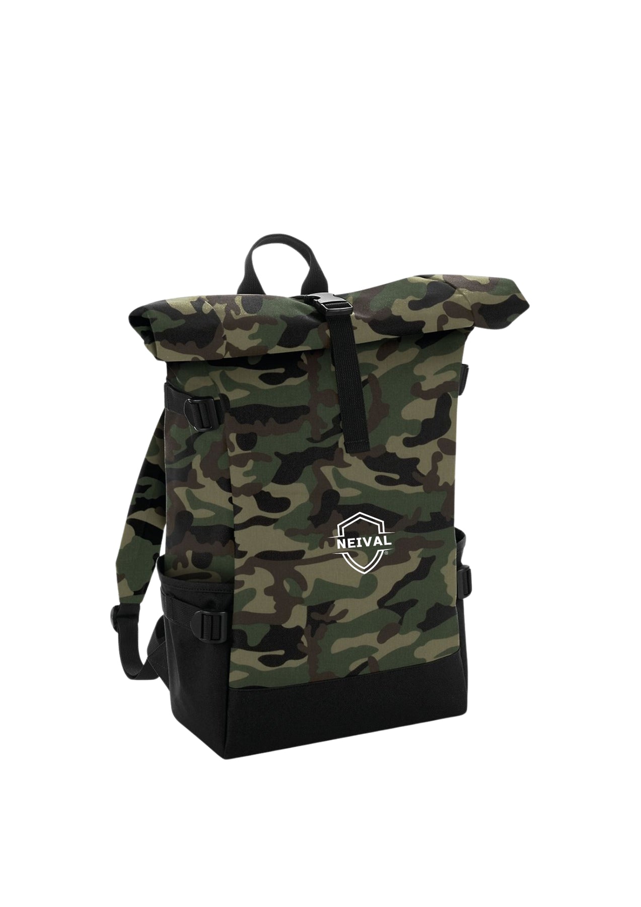 100% poliéster 600D. Mochila para laptop hasta 17", bolsillos laterales de fácil acceso, bolsillo interno con cremallera para objetos de valor, panel posterior acolchado y hombro ajustable. Dimensiones: 28x48x15 cm, capacidad: 22 litros, área de impresión máxima: 22x27 cm.