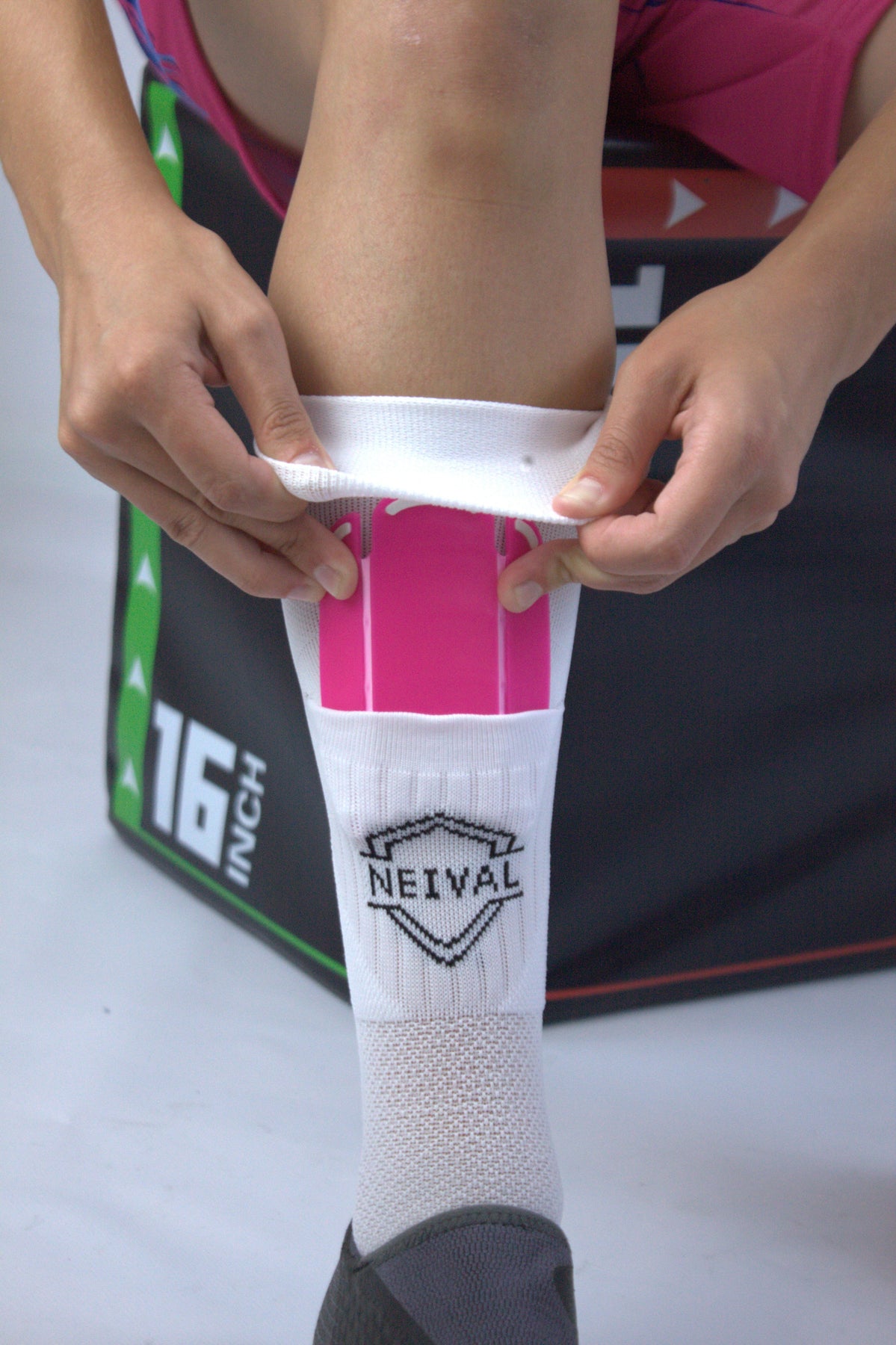 Introduce la espinillera dentro del bolsillo de los calcetines Pocket Non-Slip Pro. Así se mantiene en su sitio sin desplazarse.